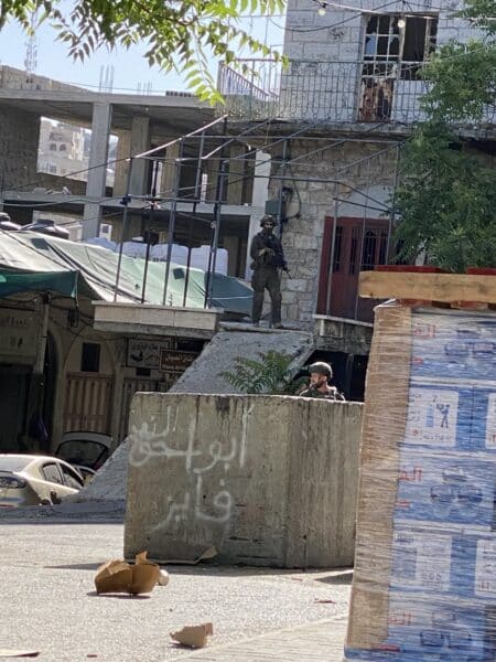 Suddenly, six Israeli soldiers all armed with live ammunition – one carrying what appears to be a rocket-propelled grenade launcher on his back and another a machine gun – march out of the military base gate and begin parading menacingly down the Palestinian streets of the Old City. They stop at least three Palestinian cars at random, checking IDs and searching trunks. We follow them and film as the soldiers make a loop around the entire market, making their presence known through intimidation and rude remarks.