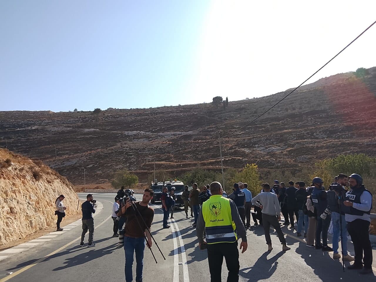 At least 16 soldiers, some armed with rifles with tear gas attachments, and others with live ammunition, forcibly marched the group – at least 40 Palestinian harvesters, 20 journalists, and six international solidarity activists – down the road for a total of 40 minutes, stopping along the way to pull different harvesters out of their groves and prevent them from picking their olives.
