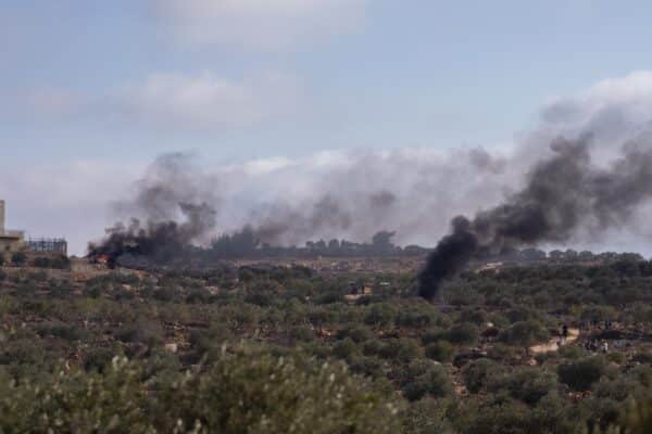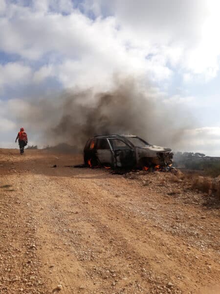 October 19, Turmusayya, East Ramallah — Around 50 settlers attacked farmers and their supporters leaving a Palestinian woman as well as a Swedish activist and an Italian activist mildly to severely injured. Settlers also torched five vehicles and damaged others with stones. The attack was carried out under the watch of Israeli soldiers observing from the hilltop overlooking the area.