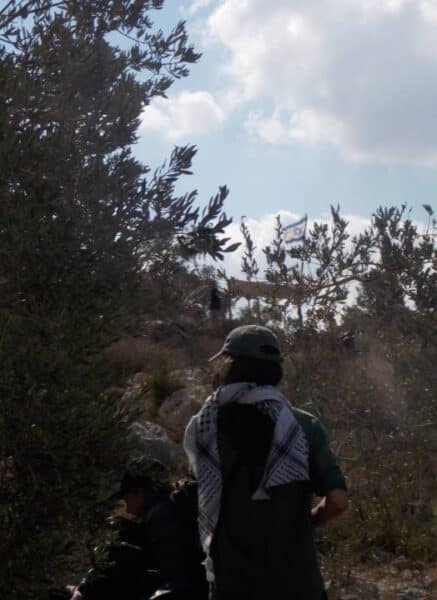 Defiantly, we reached the beginning of the outpost where settlers received us angry and tried to stop us, accompanied by their true supporters: the Israeli Occupation Forces. They already stole a lot of the olives of that grove and tried to steal the very few we had in some sacks. We stuck together, pushed together, kept walking up together while they tried to stop us. Armed, masked, threatening, violent… With the tarps and in groups, confident in what we do, we found a tree and kept picking olives. With the army behind us at the same level as the watching point of the outpost, we started singing Italian antifascist songs to ease the situation. What a powerful moment.