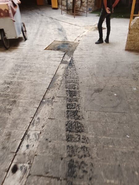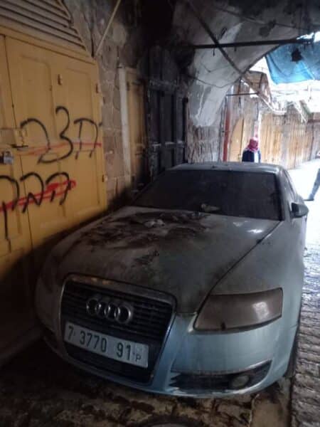 A trail of charcoal tire tracks are an unwelcome sight this morning in Hebron’s old city, tracing a grim path past shuttered shops and beneath wire netting that sags with the weight of rubbish, bottles, and stones thrown from above.
