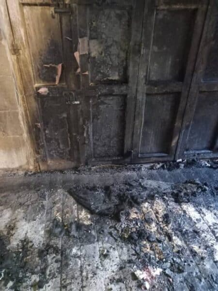 A tailor’s shop and car were firebombed last night by Israeli colonizers in the Old City of Al-Khalil (Hebron). The attackers struck before Fajr, the early morning prayer time, leaving the shopkeeper’s livelihood in disarray. Flames melted key electrical components both inside and outside the shop, with the stench of burnt plastic and textiles still lingering well into the afternoon as volunteers met with the shopkeeper. His name is Mashhour Sidqi Al-Tamimi and even in the aftermath of such destruction, he was more than willing to take us on a tour of the small shop, pointing out the places most damaged by the fire. When asked if the attack was by settlers or the army, all present simply shrugged and told us it makes no difference.