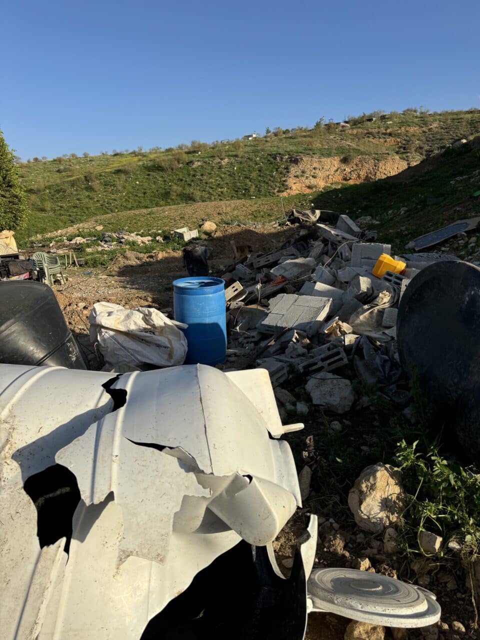 As well as flattening her entire house with bulldozers they also completely destroyed her full water containers, smashed up her solar panels, her generator and her bathroom cubicle.