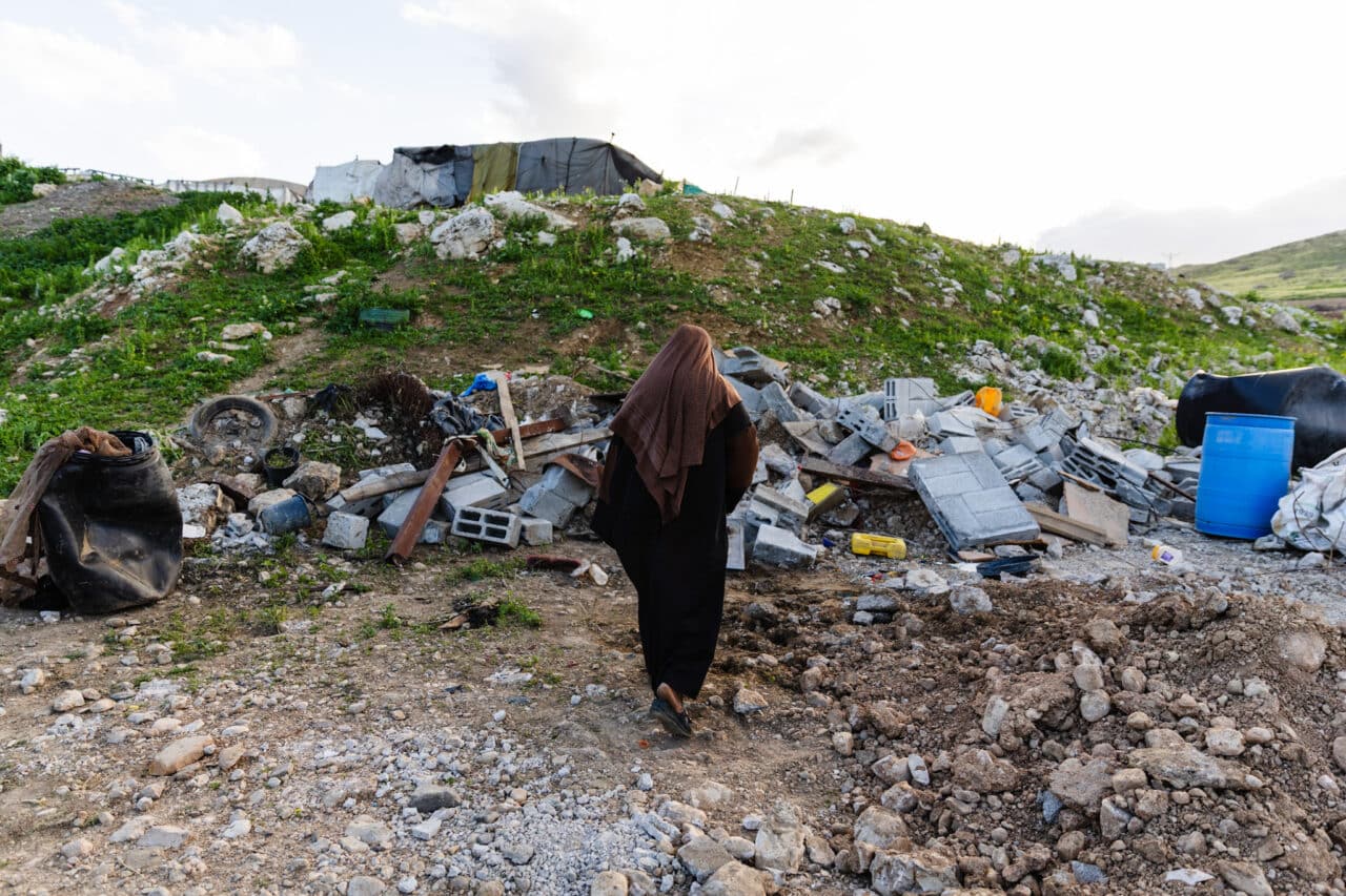 She is now living in a tiny tent next to her demolished house. There she sleeps with the few belongings she has managed to salvage from the rubble. The army destroyed everything she needs to survive, and she shared her distress about having no way to make food, nothing to protect her from the sun, no gas and no fire.
